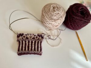 ふたつ目は編み込みのセルブミトンで説明してくれる。配色糸と地糸とが美しく表面に出るような注意点も説明している。が、説明が丁寧であれこれ喋ってくれるがゆえに、編み込み模様に慣れている人には冗長に感じるかもしれない。