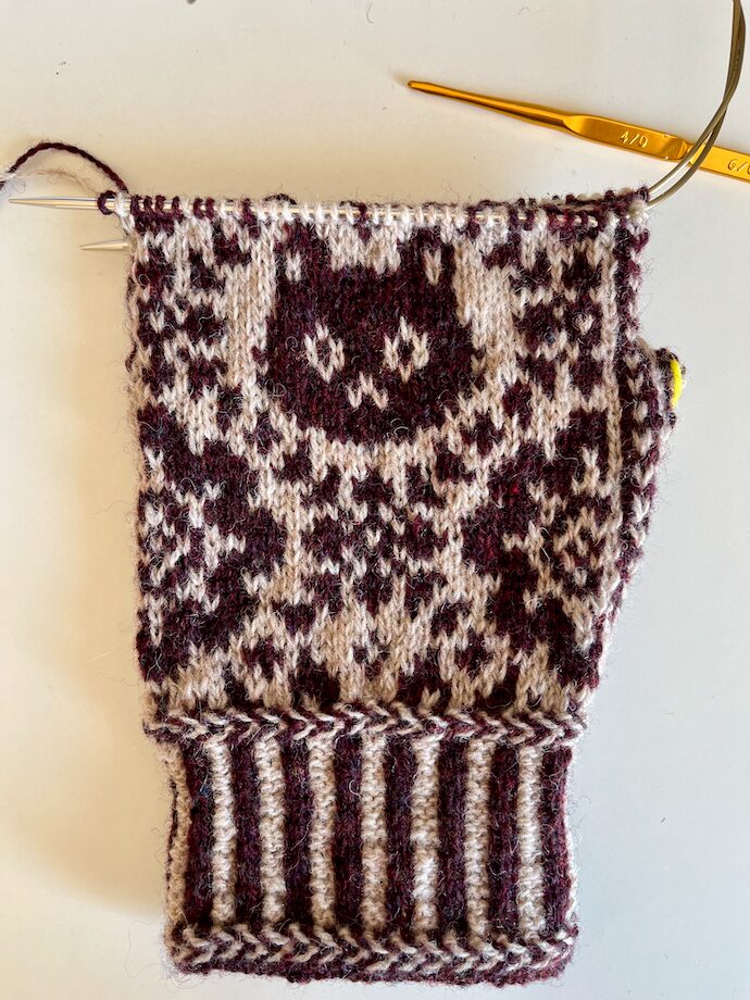 このBC Garnの細い糸で、55歳にして初めてミトンを編むことに挑戦している。
